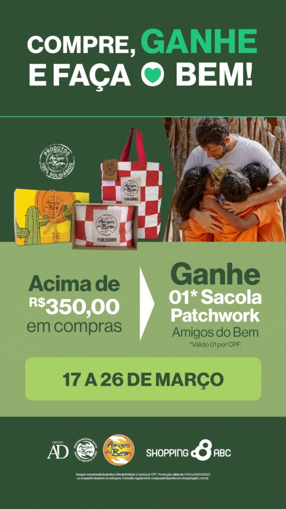 Em prol da ONG Amigos do Bem, que ajuda e contribui com mais de 150 mil famílias no sertão brasileiro, o Shopping ABC e o Grupo AD estão lançando uma campanha para clientes que realizarem suas compras entre 17 e 26 de março: acima de R$ 350 gastos em compras, o cliente ganhará 01 (uma) Sacola Patchwork exclusiva da ONG Amigos do Bem, produzida pelas famílias do projeto social, gerando renda e transformando a vida destas pessoas.